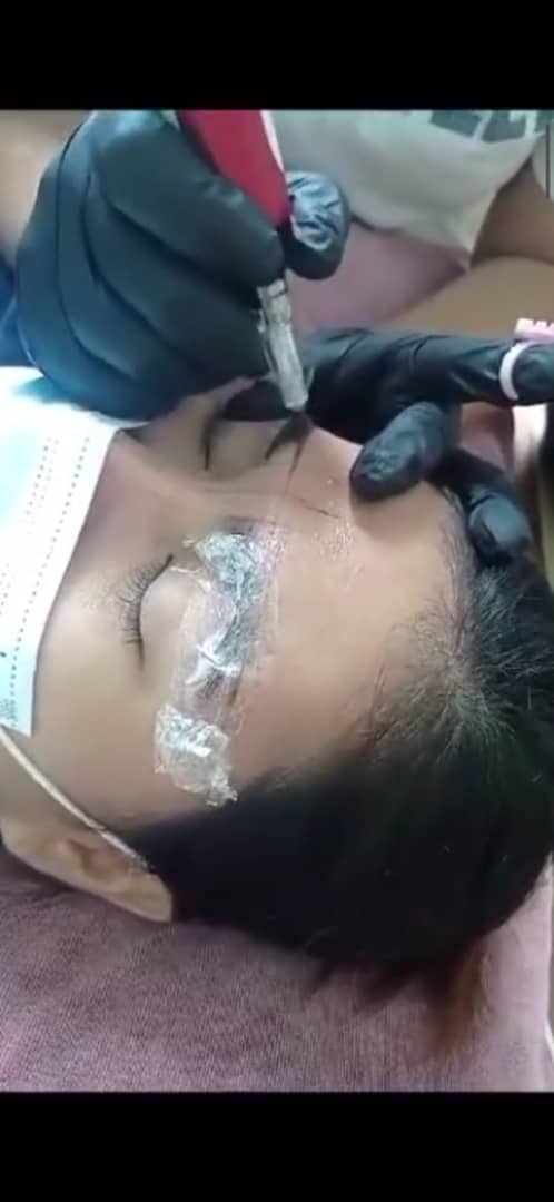- Teknik: Gunakan alat manual dengan hujung kecil seperti pisau untuk melukis garis halus yang menyerupai helaian rambut kening.